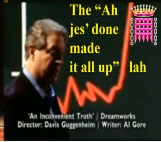 Baseado em verdadeiros factos científicos. . . suponho que os factos científicos em que se baseia devem ser tão tecnicamente investigados quanto a representação de dados deste gráfico que retirei de uma das magníficas conferências de Lord Monckton. O homem que expôs a nu a tentativa de criar um governo mundial em Conpenhaga 2009 e que tem esclarecido as pessoas sobre o clima. Vejam se descobrem o que há de errado com este gráfico "científico" antes de lerem em baixo.